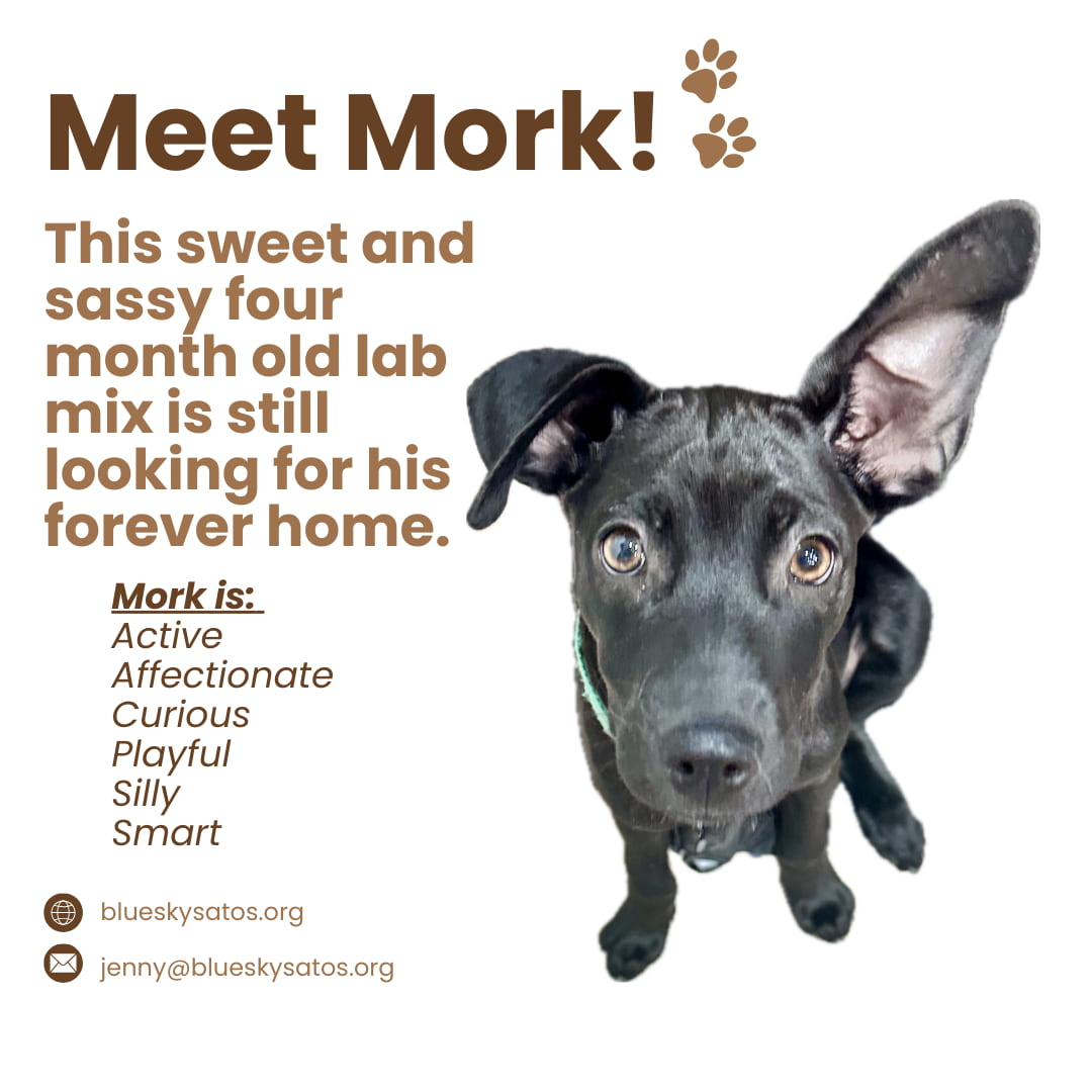 Jenny Fox, who fosters dogs, has this cute puppy available for adoption. If you would like to add Mork to your family or have any questions, please contact Jenny.