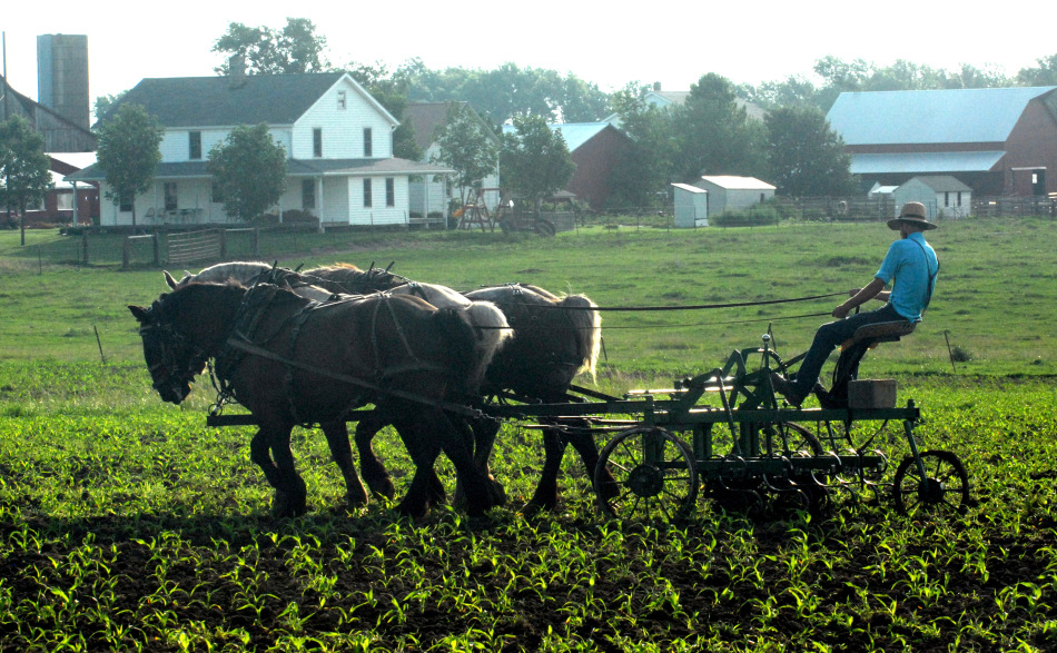 Amish cultivating corn